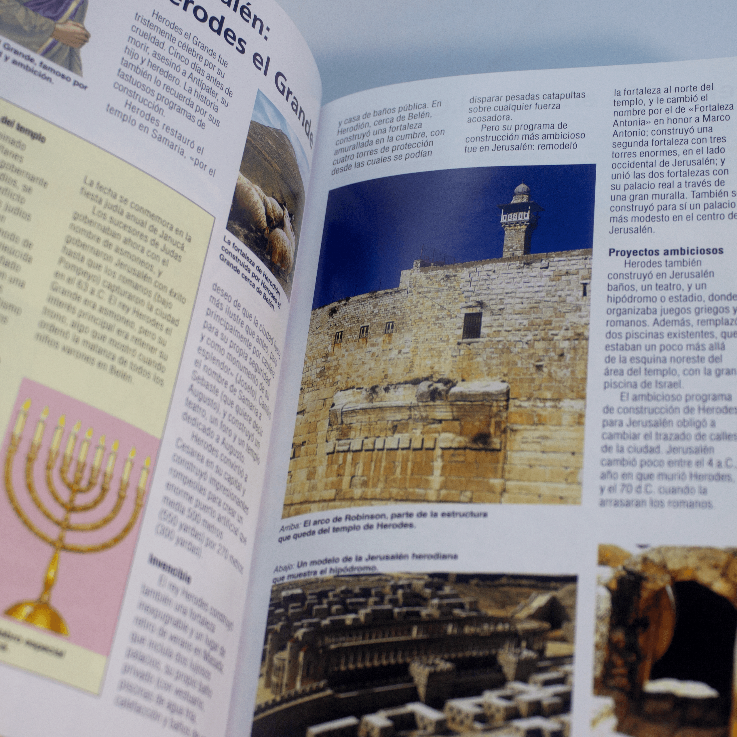 Características Especiales: Sección de Enciclopedia de 228 páginas con ilustraciones a todo color sobre la vida en tiempos bíblicos, personajes e historia de las tierras bíblicas.
